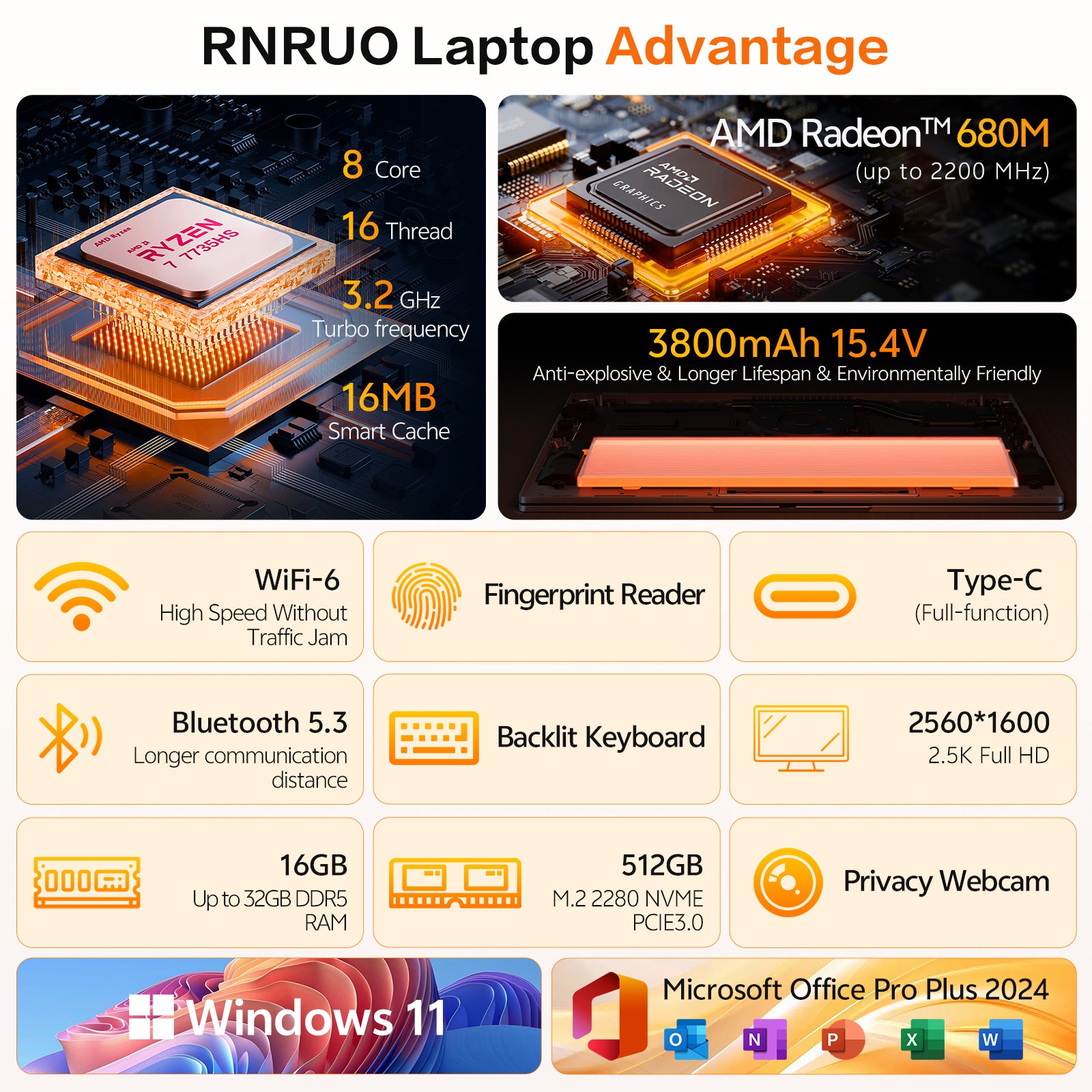 RNRUO 15.9" Gaming Laptop, 16GB DDR5 RAM 512GB SSD, AMD Ryzen 7 7735H, 8 Cores Up to 4.75GHz, 2560*1600 Display Fingerprint Backlit KB, WiFi6 BT5.3, Windows 11 Computer for Gaming, Business, Study
